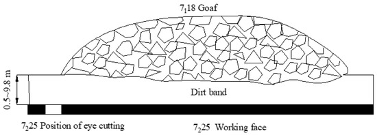 Furthermore, the 72 coal seam belongs to the lower Shihezi Formation of the lower Permian System with a thickness of 1.7 m–3.7 m and an average thickness of 2.5 m, which reflects the stable occurrence and has a spacing of 0.8 m to 9.3 m from the upper 71 coal seam. The spatial relationship between the 7118 goaf and the 7225 working face discussed in this study is depicted in Figure 8. The elevation of the 7118 goaf is −447.9 m~−480.6 m, and the ground elevation is +25.0 m.