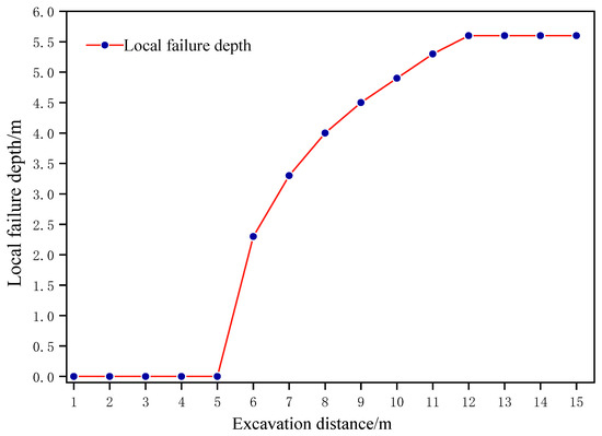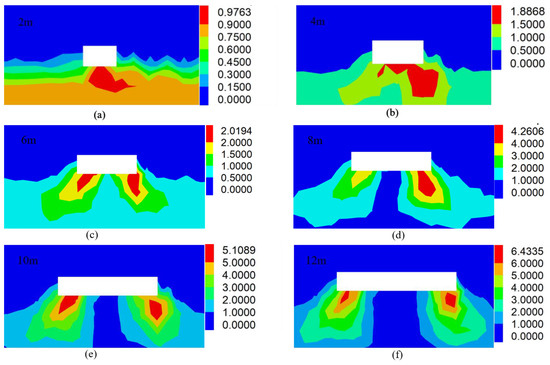 Although the synergetic theory of information entropy based on the failure approach index has calculated that the floor surrounding rock system of 71 coal seams performs steady from a macroscopic perspective, the local area of floor surrounding rock is damaged with respect to the microscopic rock mechanics, as displayed in Figure 10. According to the partition significance of failure approach index, when , the rock and soil mass is in a state of failure [14]. When advancing 0–6 m above the 7118 working face, there is no damage to the floor surrounding the rock. Nonetheless, when the working face is excavated to 6 m, the local failure of the floor surrounding the rock will emerge, and the maximum failure depth will reach 2.3 m. With the advance of the 7118 coal mining work face, the abutment pressure of the stoping work face in front and behind becomes increasingly evident. When the working face is excavated to 12 m, the local failure depth of the floor surrounding the rock will reach 5.6 m. At this moment, the failure depth of the floor surrounding the rock grows to a peak of 5.6 m and tends to be stable, as exhibited in Figure 11. Consequently, it is consistent with the reference [31] that the depth of floor failure caused by the mining of 71 coal is no more than 6 m. In view of the local failure area’s enormous stability influences, advanced grouting reinforcement measures should be taken to ensure the safe and efficient stoping of 72 coal seams.