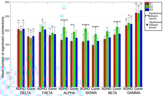Bars indicate the mean number of connections for each band in the three epochs: E1 (pre-spindle), E2 (spindle) and E3 (post-spindle), with the standard deviations, in children with ADHD and in Controls. The symbol * highlights significant statistical differences between the two groups; horizontal lines indicate differences among epochs within each group.