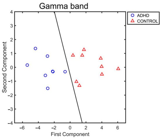 Representation of the first two components resulted from Principal Component Analysis (PCA) in the gamma band. Red triangles represent Controls group, blue circles ADHD group. Black line is the result of the application of the Fisher linear discriminant rule evaluated as K + L(1)x1 + L(2)x2 = 0.