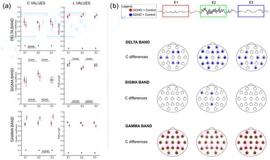 Significant differences for C and L values between the two groups in all three epochs were found in the delta and gamma bands, while in the sigma band, the differences, although present, were not significant. In particular, C values were higher in ADHD than in the controls in the three epochs of the delta and sigma bands, while in the gamma band, the highest values were observed in the controls. On the other hand, L values showed an opposite behavior in all the epochs and bands. Furthermore, C values showed significant differences among epochs only for ADHD between E1 and E2 in the delta band and between E2 and E3 in the gamma band. In the sigma band, both C and L values showed significant differences between E2 and the other two epochs for both ADHD and controls, with the highest C values and lowest L values in E2 in both groups.