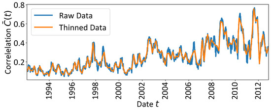 The procedure chosen to calculate the mean market correlation of the S&P500 stock index is chosen analogously to the articles [1,12]. Confined to the considered time period between 1 January 1992 and 28 December 2012, we filter for companies that are included in the S&P500 index for at least 99.5% of the time and interpolate occasionally missing data. The data are used to compute pairwise correlations of the locally normalised returns of the remaining 249 daily-resolved stock price time series for 5291 trading days. The correlations are computed on overlapping rolling data windows of size . Shown by the principle component analysis in [1], the mean correlation,