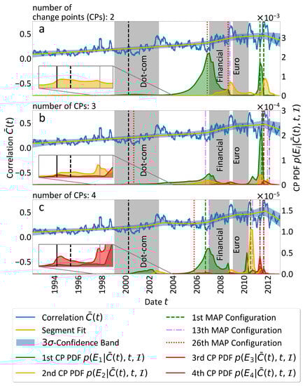 We conclude the CP analysis discussion with some remarks on the consistency of the results. The blue mean market correlation in Figure 2 is well-fitted by the orange segment fits with corresponding -CBs. The CBs quantify the certainty of the given fit based on the surrounding data information. In that sense, the narrow shape of the CBs suggests that the fit performs well for the underlying mean market correlation data . A comparison of the very similarly shaped fits (a–c) also confirms the robustness of the results. Finally, we studied the individual most probable CP configurations three of which are drawn by green dashed, violet dash-dotted and red dotted vertical lines in Figure 2 as an example. In (a–c) the most probable configurations are clustered around the CP PDF peaks of the global financial crisis and the Euro sovereign debt crisis. The dot-com bubble is included only a bit later in the most probable configurations, but consistent with the less pronounced CP PDFs of that period. However, the first configuration that includes a date between the 1 January 1999 and the 1 October 2002 is identified to be the 264th of 8385 total configurations in (a), the 26th combination of 357,760 in (b) and the 354th of 11,358,880 configurations in (c). This corresponds to the most probable 3.15%, % and % configurations in (a), (b) and (c), respectively, and round out our analysis.