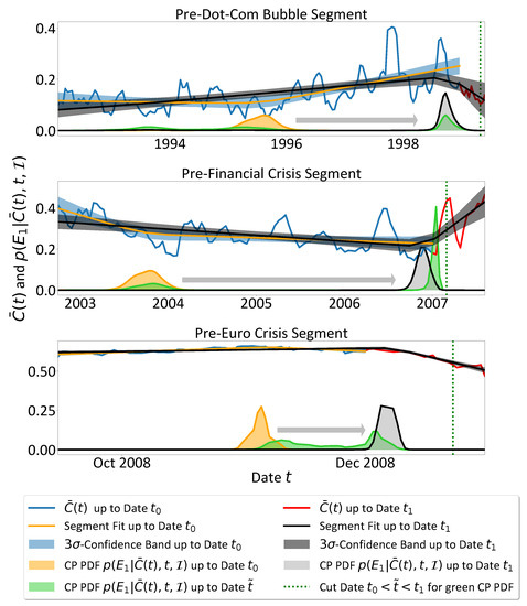 In the CP analysis of the mean market correlation from 31 January 1992 until 28 December 2012 in Section 3.1, we take a retrospective point of view to investigate whether the linear trend changes in the mean market correlation encode information about economic crisis events of global importance. Since our findings in Section 3.1 suggest indeed such a connection, in this subsection we complement the consistency of our results by changing from a retrospective to an online perspective. From the online viewpoint three key questions arise: First, is the time evolution of the CP PDFs of one CP E consistent with our expectations if we apply it to currently available data and update these data whenever new trading days end? Second, how much data of a changing mean market correlation trend, which potentially marks an important economic period, has to be included to render the CP analysis sensitive? And third, do the results change consistently on the stronger timely confined data segments, i.e., do the CP PDFs mirror in a way the relative impact of the events included in the sub-intervals? To answer these questions, we assume one CP and compare the CP analysis results calculated on two slightly differing types of time series segments for the dot-com bubble, the global financial crisis and the Euro crisis. The first type is limited exclusively to pre-crisis data of the mentioned major crisis events and the second type includes a small amount of mean market correlation data beyond the crises’ onsets at , i.e., it is cut after . The results are presented in Figure 3. For the pre-dot-com bubble segment as well as for the financial crisis data we used every tenth data point to avoid numerical instabilities due to an overflowing normalisation factor of the CP PDFs. The short segment of the Euro crisis is not thinned at all. Analogously to Section 3.1 we show the accompanying segment fits of the orange and the black CP PDFs in Figure 3 to illustrate the most probable linear segments each of which might resemble specific economic periods.