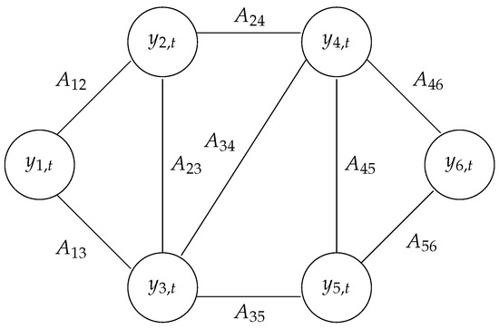 Let us consider a weighted, undirected graph composed of vertices. is the weighted adjacency matrix, where represents the strength of the interaction between nodes i and j. An example of such a graph is depicted in Figure 1. is the set of edges, and therefore implies and implies . The graph can be defined through the (unnormalized) Laplacian matrix :