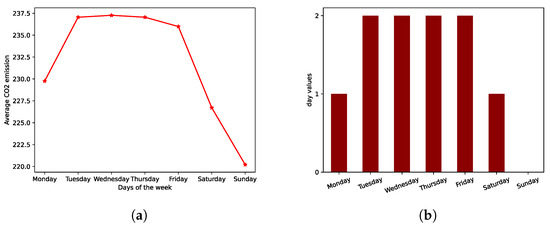 Choice of the covariate WD to encapsulate information about the weekday for the CO emission. (a) Spatial and temporal average of the CO emission per weekday. (b) Values assigned to the covariates WD depending on the current weekday.