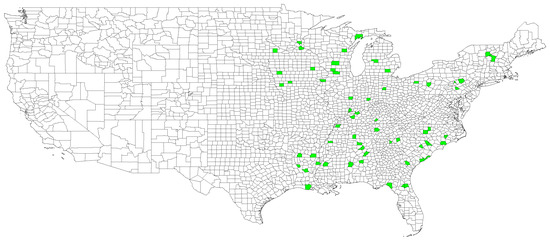 US counties selected as nodes of the graph depicted in green.