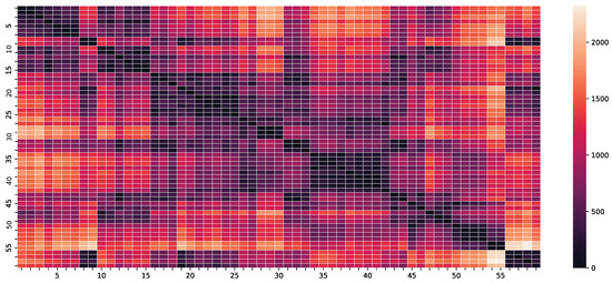 where denotes the geodesic distance between the i-th and j-th counties in kilometers and l is a scaling hyperparameter to be optimized using Algorithm 1. A heat map of the geodesic distances in kilometers between counties is represented in Figure 5.