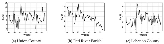 In Figure 6, the weekly RMSE is depicted as a function of time for three different counties. These weekly RMSEs are obtained by aggregating the daily forecasted values from the proposed regression model which is trained on 50% of the dataset. It is interesting to observe that the weekly RMSE does not explode with time but rather stays quite stable with respect to time.