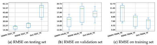 In the following numerical experiments, the proposed penalized regression model over graph is compared to two other classical models, namely, the ridge and the ordinary least square (OLS) solution. In fact, these two models are nothing but special cases of the proposed model by setting in Equation (16) either or , respectively.