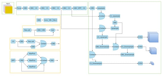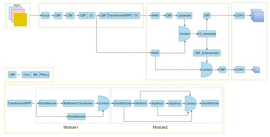 The figure shows the diagram of our improved HE-YOLOv5s model. By comparing Figure 1 and Figure 2, we can carefully find that our proposed model cuts some modules and replaces some modules, such as converting CBS to CBF, a process that replaces the SILU activation function with the FRELU activation function. Another improved SPPF is shown as TransformerSPPF in Figure 2, which is divided into two parts: module 1 and module 2. Module 1 is obtained by improving the BottleneckTransformer module in the second figure in Section 3.4, and module 2 is obtained by replacing the convolution module in the SPPF part with the Ghostmodule.