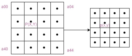 The computational cost of nearest neighbor interpolation is small, but the processing of images using this method can lead to jagged images. This paper, therefore, introduces bicubic interpolation without adding too much to the computational cost of the calculation. As shown in Figure 7, the bicubic interpolation algorithm calculates the weights based on the 16 surrounding pixel points and accumulates them to obtain the pixel values of the added points. Among other things, the method is based on the following idea: