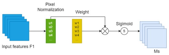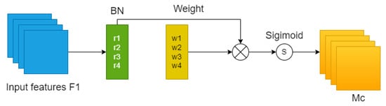 As shown in Figure 8, this module uses the scaling in BN directly to calculate the attention weights without additional calculations and parameters, such as additional fully connected layers and convolution, and suppresses insignificant features by adding regularization. This module is similar to the CBAM module divided into two parts: as shown in the figure, the channel attention module is a normalization operation for the input features at different scales, which uses the scaling factor in BN, i.e., Equation (2), and then the corresponding weights are obtained after the Wr operation in Equation (3), and finally the output features are obtained by the Sigmod function. The only difference between the spatial attention module and the channel attention module is the normalization operation; in the spatial attention module, as shown in Figure 9, we perform pixel normalization on the input features, and finally perform the same operation as the channel attention module to obtain the final output features, i.e., Equation (4). In addition, we add a regularization term to the loss function, i.e., Equation (5), to suppress the unimportant features to rationalize the use of resources.