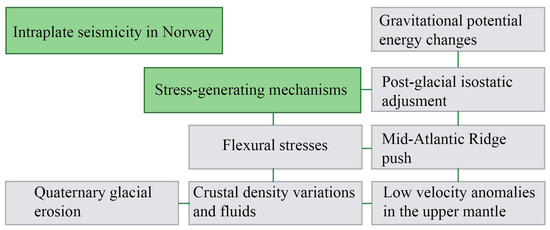 It is commonly accepted by the seismological community that this intraplate activity emerges due to a combination of stress-generating mechanisms, which include crustal to local scale (Olesen et al., 2013): (i) gravitational potential energy changes produced due to topographic loads, (ii) post-glacial isostatic adjustments, (iii) Mid-Atlantic ridge push (iv) Quaternary glacial erosion (v) flexural stresses through sedimentation [17], (vi) crustal density variations, and spatial coincidence with anomalous low-velocity zones of seismic waves in the upper mantle [50,51,52] (Figure 1).