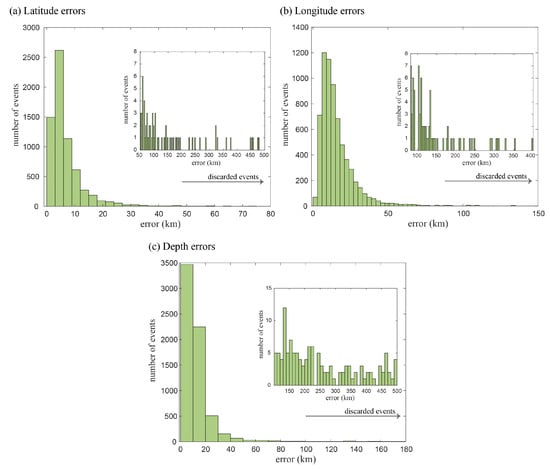 Figure 3. (ac) Histograms with location errors in latitude, longitude and depth, respectively.