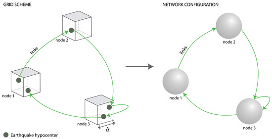 Then, we place the connections between the nodes following the temporal sequence of the seismic events, so the order of events is preserved as in the standard time analysis [56,57,58]. The direction of the connections between nodes is defined through the temporal sequence of the seismic events in the region, as shown in Figure 5.