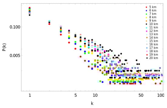 Figure 6. Log-log plot of the degree distribution for the studied complex networks. The complex networks were built with values of the side between Δ = 5 km and Δ = 20 km. The scale-free behavior is clear.