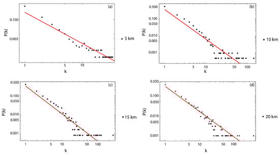 Figure 13. Examples of the scale-free behavior of the degree distribution of nodes with the respective linear fit for the dataset with the completeness magnitude. (a) Degree distribution for Δ = 5 km. (b) Degree distribution for Δ = 10 km. (c) Degree distribution for Δ = 15 km. (d) Degree distribution for Δ = 20 km.