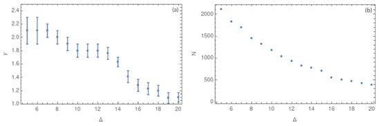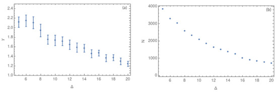 Figure 10. (a) Values of the critical exponent γ in 2 dimensions for Δ between 5 and 20 km. (b) Values of the number of nodes N for each value of Δ between 5 and 20 km.