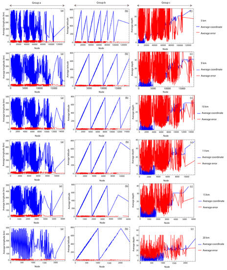 Figure 9. Values of the average coordinates in longitude (group (a)), latitude (group (b)), and depth (group (c)) and associated errors. These plots correspond to Δ equal to 5, 9, 10, 11, 15, and 20 km, from top to bottom. All averages are in km.