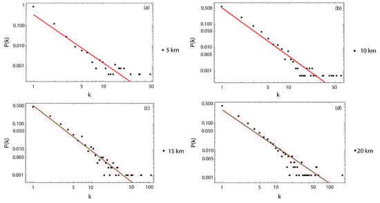 Figure 7. Examples of the scale-free behavior of the degree distribution of nodes with their respective linear fits. (a) Degree distribution for Δ = 5 km with γ = 2.1 ± 0.1. (b) Degree distribution for Δ = 10 km with γ = 1.7 ± 0.1. (c) Degree distributions for Δ = 15 km with γ = 1.45 ± 0.08. (d) Degree distribution for Δ = 20 km with γ = 1.24 ± 0.05.