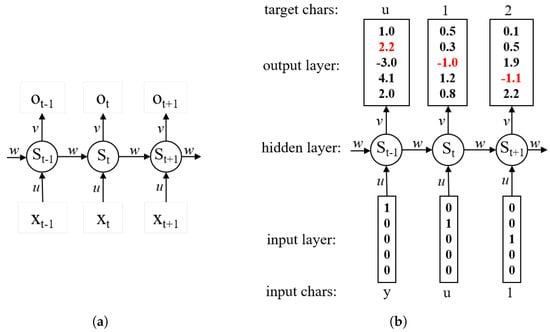 The basic premise of the password guessing method using RNNs is that password guessing can be considered as a sequential text generation task. As shown in Figure 3b, the activations in the forward pass when the RNN is fed the characters yu1 as input. The output layer contains confidences the RNN assigns for the next character (vocabulary is ‘y,u1,2,3’). We can see that, in the first time step, when the RNN saw the character y, it assigned a confidence of 1.0 to the next letter being y, 2.2 to the letter u, −3.0 to 1, 4.1 to 2, and 2.0 to 3. Since in our training data (the password string yu123) the next correct character is u, we would like to increase its confidence (red) and decrease the confidence of all other letters (black).