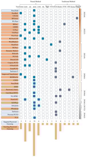 With the continuous improvement of Internet application ecology, people have to set many passwords that satisfy different password policies to protect the corresponding software applications. As a result, each person has to remember many passwords in daily life. However, human memory capacity is relatively limited. Only five to seven passwords can be remembered [2]. Under this contradiction, users inevitably take measures to help memorize passwords, such as using weak passwords with low information entropy [3], using personal-related information in passwords [4,5], or reusing the same password in multiple systems [6,7]. Although these methods reduce the difficulty of password memorization, they are associated with serious security threats, allowing password guessing attacks to take advantage. Furthermore, a great deal of well-known websites’ password files have been leaked, which provides a constant source of material for password guessing to improve the attacking algorithm. In addition, with the prosperity of artificial intelligence, a large number of neural approaches for password guessing are emerging and the guessing ability has been continuously enhanced. In such circumstances, password security faces unprecedented pressure. Therefore, it is incredibly urgent and vital to sort out the research related to password guessing systematically. This review can present a reference for developers to design password authentication and provide password security researchers with a comprehensive understanding of the research dynamics in related fields. Table 1 lists all the abbreviations we make use of throughout this review.
