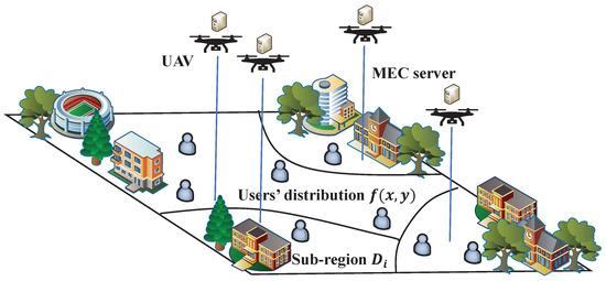 In our proposed system, as shown in Figure 1, a geographical area is considered, where N users are located according to a given distribution over the two-dimensional plane. The network capacity is supported by K heterogeneous UAVs, equipped with communication devices and computing servers. As the users’ computation capability is limited, their computing tasks are uploaded to MEC servers equipped on UAVs, which results in K disjoint UAV-serving sub-regions. We use the three-dimensional (3D) coordinate to denote the UAV and to denote the corresponding serving region. In each sub-region , users first upload their computation tasks to the associated UAV, then wait for the MEC server to calculate these tasks, and finally receive the results.