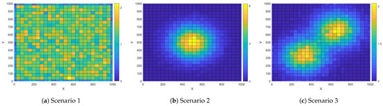 where represents a weight factor. and represent two truncated Gaussian distribution models. In our bimodal user distribution, we set mean values as , ; the variance values are , and . These three models correspond to user uniformly distributed scenario, single hot spot scenario and multiple hot spots scenarios such as carnival in a park or sports events. The user distributions are shown in Figure 2.
