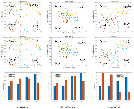 In Scenario 3, we note that a significant proportion of users (about 75%) is associated with the small UAVs () under the SNR-based scheme from the top of Figure 4c. However, when the OTT-based association scheme is employed, the medium () and large UAVs () extend their coverage areas to alleviate the computing pressure on the located near the hotspots. Specifically, the proportion of users served by the and rises from 12.5% to 27%, and from 12.5% to 33%, respectively. Concurrently, the number of users covered by and decreases from around 39% to 20%, and from 36% to 20%, respectively. These changes occur because the OTT-based association scheme considers not only the signal strength received by users but also the user distribution and UAV location. The results drawn from this scenario affirm that the proposed OTT scheme can significantly balance the load among UAVs with diverse capabilities, offering a marked improvement over the baseline scheme.