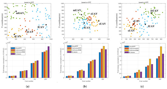 User association, UAV deployment and the energy consumption of Algorithm 2 versus different scenarios. (a) Scenario 1. (b) Scenario 2. (c) Scenario 3. UAVs are represented by black stars, users are represented by dots, and different colored dots represent users belonging to different UAV serving regions.