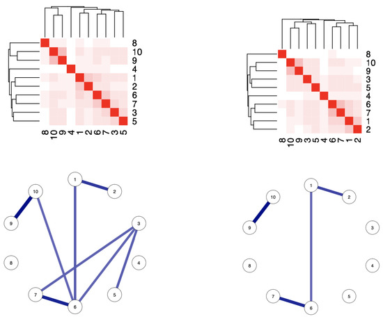The network that refers to the sample of boys has more linkages between the 10 items, while the females’ network is more sparse. This is one important aspect of heterogeneity with respect to the gender axis. The four linkages of the females’ network are among clearly positive questions {1, 2, 6, 7} and strongly negative questions {9, 10}, respectively. In contrast, beyond the aforementioned four linkages, the males’ network distinctively contains 3 more linkages between clearly positive and clearly negative questions: {3, 6}, {3, 7} and {10, 6}. This network also reveals a linkage between two clearly, but not strongly, negative questions {3, 5}.