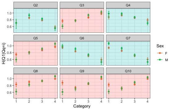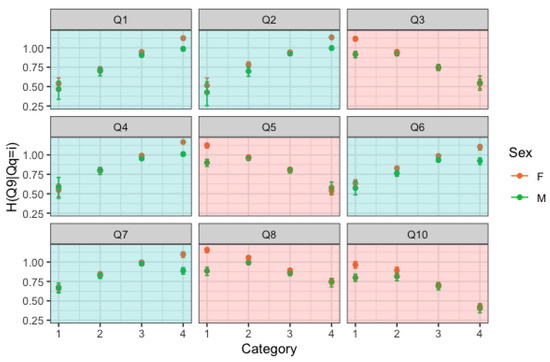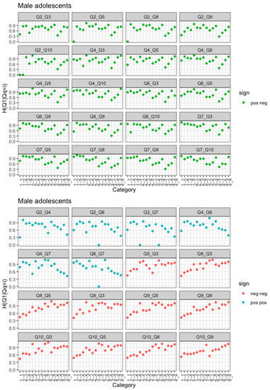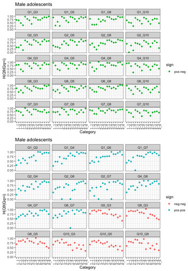 We now consider only the largest age group, i.e., late adolescents. We fix the response variable as a positively posed question (for instance ), and we let the covariate change. Looking at Figure 4, we can see that every time the covariate is a negatively posed question, a trend of decreasing entropy can be observed, while whenever we condition on levels of a negative item, then we observe a trend of increasing entropy. Note that the same trend, though not as clear, can be found in individuals of older ages, as previously described by Figure 2 and Figure 3.