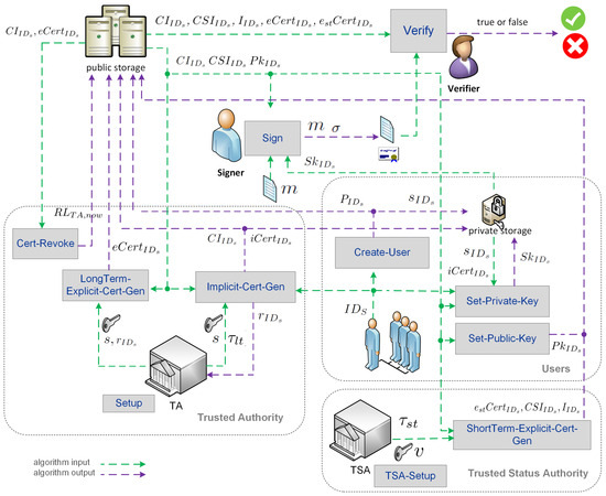 - Verify , , , , , , . Everyone can run the algorithm Verify to check the validity of a signature. Taking as input a message/signature pair , a user’s certificate information , a certificate status information , an auxiliary public information , and long- and short-term explicit certificates (, ), it outputs when σ is a valid signature. Otherwise, it outputs .