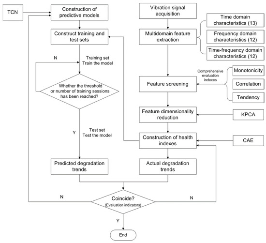 Contact fatigue is one of the most common failure forms of typical basic components such as bearings and gears. Accurate prediction of contact fatigue performance degradation trends in components is conducive to the scientific formulation of maintenance strategies and health management of equipment, which is of great significance for industrial production. In this paper, to realize the performance degradation trend prediction accurately, a prediction method based on multi-domain features and temporal convolutional networks (TCNs) was proposed. Firstly, a multi-domain and high-dimensional feature set of vibration signals was constructed, and performance degradation indexes with good sensitivity and strong trends were initially screened using comprehensive evaluation indexes. Secondly, the kernel principal component analysis (KPCA) method was used to eliminate redundant information among multi-domain features and construct health indexes (HIs) based on a convolutional autoencoder (CAE) network. Then, the performance degradation trend prediction model based on TCN was constructed, and the degradation trend prediction for the monitored object was realized using direct multi-step prediction. On this basis, the effectiveness of the proposed method was verified using a bearing common-use data set, and it was successfully applied to performance degradation trend prediction for rolling contact fatigue specimens. The results show that using KPCA can reduce the feature set from 14 dimensions to 4 dimensions and retain 98.33% of the information in the original preferred feature set. The method of constructing the HI based on CAE is effective, and change processes versus time of the constructed HI can truly reflect the degradation process of rolling contact fatigue specimen performance; this method has obvious advantages over the two commonly used methods for constructing HIs including auto-encoding (AE) networks and gaussian mixture models (GMMs). The model based on TCN can accurately predict the performance degradation of rolling contact fatigue specimens. Compared with prediction models based on long short-term memory (LSTM) networks and gating recurrent units (GRUs), the model based on TCN has better performance and higher prediction accuracy. The RMS error and average absolute error for a prediction step of 3 are 0.0146 and 0.0105, respectively. Overall, the proposed method has universal significance and can be applied to predict the performance degradation trend of other mechanical equipment/parts.