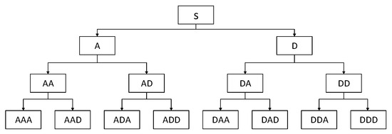 Considering the feature number and the decomposition degree of the signal, this paper selects a total of 12 feature parameters for the energy ratio of each node in the second and third layers of the signal wavelet packet decomposition as the time–frequency domain features. According to the position of each node in the wavelet packet signal decomposition tree diagram shown in Figure 2, for the second layer and the third layer, in order from left to right, the eigenvalues calculated using the coefficients of each node are numbered as f26–f29 and f30–f37.