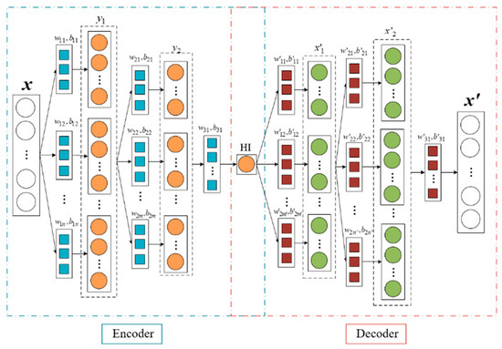 (1) In terms of HI construction, in view of the information loss problem faced by the construction of one-dimensional HI using multi-domain feature extraction, on the basis of multi-domain feature extraction, a method using KPCA to reduce feature dimensionality and CAE network to construct performance degradation HI is proposed. The results show that KPCA can reduce the dimension of the feature set and retain more than 97% of the information in the original data. Furthermore, the change process of the HI constructed using the CAE network truly reflects the performance degradation process of the monitored object. Compared with the AE network and GMM, this method has obvious advantages.