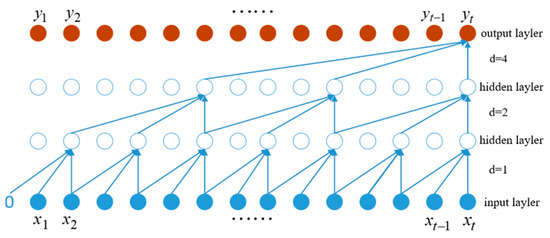 Figure 4 illustrates the process of representing one-dimensional full convolution, causal convolution, and dilated convolution with dilated causal convolution, where the input sequence is , the output sequence after the three-layer one-dimensional dilated causal convolution operation with a convolution kernel size of 3 is , and the dilation coefficient in the convolution calculation , generally d = 2.