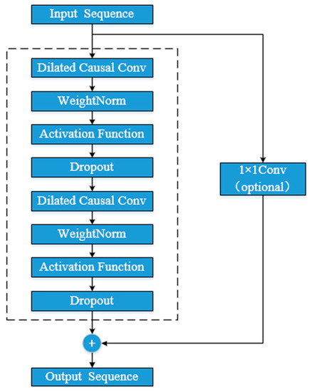 In addition, TCN uses residual block connection to increase the network depth. By connecting multiple residual blocks together, the gradient problem can be effectively weakened, and the model receptive field can be further increased. The form of each residual block is shown in Figure 5.