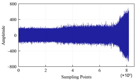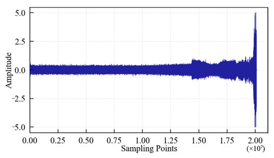 The bearing public data contain three test data, and the second test data are used in this paper. Among them, the sampling frequency of the experiment is 20 kHz, data are collected every 10 min, and 20,480 sampling points are collected each time. The test ran for a total of 8 days. The acceleration signals of the four bearings corresponded to the four channels in the data set, respectively. Finally, the test ended when the outer ring of the 1#bearing failed. A total of 984 times were collected. Therefore, a total of 984 × 20,480 sampling points were collected.