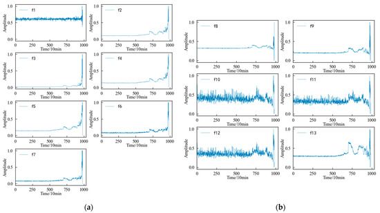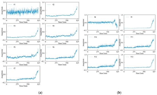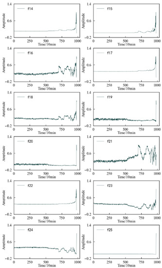 According to Figure 10, it can be determined that the change process of the 12 frequency domain features over time is not the same. Except for the frequency domain feature 7, the other features change when the 1#bearing fails, which shows that the frequency domain features better reflect the performance degradation process of the 1#bearing. However, some frequency domain features, such as frequency domain features 1, 2, 5, and 6, decrease in amplitude after the 1#bearing failure and further decrease over time until the performance degrades sharply and their amplitude fluctuates drastically.