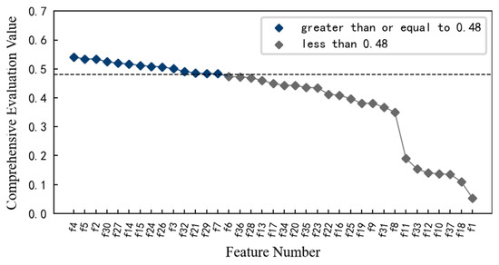 Similarly, in order to obtain the features that are sensitive to the contact fatigue degradation process of the specimen, the monotonicity, correlation mean and trend of 37 multi-domain features are calculated using Equations (4)–(6). On this basis, the comprehensive evaluation index for each feature is calculated using Equation (3), and the result is shown in Figure 28. Considering the comprehensive evaluation value and degradation process of each feature, and considering the dimension of the feature set, the features with comprehensive evaluation value greater than or equal to 0.4 are reserved to form the optimal feature set, which includes 14 features such as feature f9, feature f13, and feature f7. These preferred features better reflect the performance degradation process of the specimen.