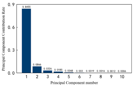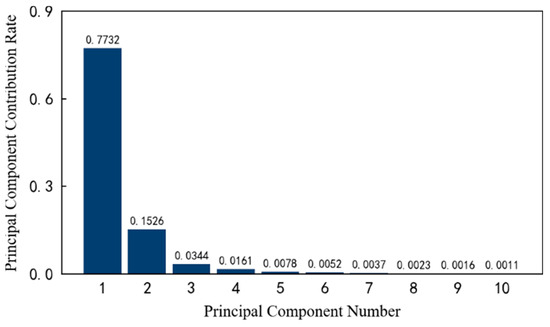 Secondly, the contribution rate of each principal component is calculated in a high-dimensional space. Taking the previous 10 principal components as an example, the respective contribution rates are shown in Figure 13. It can be seen that the first and second principal components account for 77.32% and 15.26% of the original data information, respectively. The larger the subsequent principal component number, the smaller the contribution rate, which gradually approach zero.