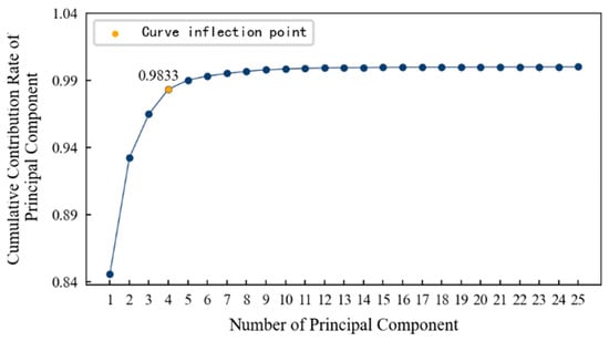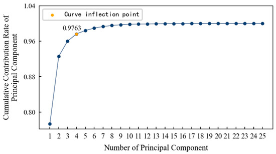In order to determine the appropriate dimension, the cumulative contribution rate curve of the principal components is drawn, as shown in Figure 14. It can be seen that: (1) With an increase in the principal components, the cumulative contribution rate of principal components becomes smooth after a large increase and finally approaches 1 infinitely. (2) The inflection point on the curve is roughly at the fourth principal component. After that, even if the number of principal components continues to increase, the cumulative contribution rate will not increase significantly. Therefore, this paper selects the first four principal components as the features after dimension reduction, and their cumulative contribution rate reaches 97.63%. That is to say, the features after dimension reduction contain 97.63% of the information in the original data, and it is most appropriate that the dimension is reduced from 14 dimensions to 4 dimensions.