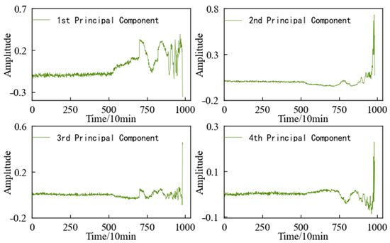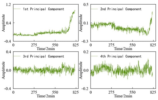 The variation trends in the first four principal components of the specimen are shown in Figure 31. Using feature dimensionality reduction, the optimal feature set of the specimen is reduced from 14 dimensions to 4 dimensions. After dimensionality reduction, the feature set contains 98.33% of the information in the optimal feature set, achieving the purpose of reducing the dimension without losing a lot of information.