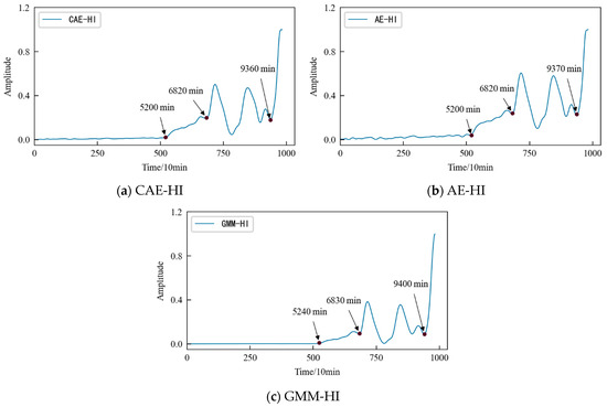 The dimensionality-reduced features are used as the input value and target value for the CAE network for training, and the obtained encoded features are used as the HI for the specimen. Similarly, the AE network and the GMM are used to construct the HI for the specimen, respectively, for comparison. The HI obtained using the three different methods were denoised and smoothed, as shown in Figure 32.