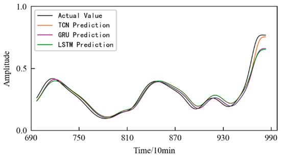 (2) Regarding prediction model construction, in view of the shortcomings of the commonly used prediction model based on recurrent neural networks, such as low parallel computation and small receptive field of input data, a performance degradation trend prediction method based on multi-domain features and TCN is proposed. The results show that the prediction model constructed using the TCN algorithm can accurately predict the performance degradation trend of the monitored object, and the constructed prediction model has better performance and higher accuracy than the prediction models using the LSTM network and GRU.
