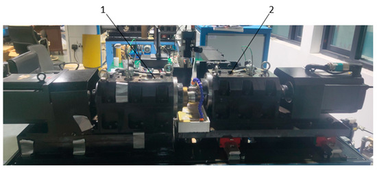 The data used in the verification test come from the rolling bearing life data set of the NSF I/UCR Intelligent System Maintenance Center in the United States. The structure of the test bench is shown in Figure 7. The DC motor drives the drive shaft to rotate with a speed 2000 r/min. The applied radial load is 6000 lbs (i.e., 2721.5 kg), and four double-row cylindrical roller bearings (Rexnord ZA-2115) are installed on the drive shaft. The 353B33 high-sensitivity ICP accelerometer from the PCB company and the 6062E acquisition card from the NI company are used to collect the vibration signal of the bearing.