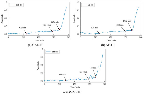 The comparative analysis shows that: (1) The HI constructed using the three different methods show a consistent degradation trend, and the change process reflects the performance degradation process of contact fatigue in the specimen, which is consistent with the process of rolling contact fatigue in the specimen in Figure 23. (2) In the early stage of the test, due to the relatively stable running state of the specimen, the amplitudes of the HI were generally stable, but slightly fluctuated due to the influence of the test environmental conditions. (3) With the progress of the test, the specimen became damaged, and the amplitude of the HI showed an increasing trend. Figure 32 shows that AE-HI and GMM-HI began to increase significantly after 520 min and 600 min, respectively, while CAE-HI began to show an increasing trend after 502 min, i.e., compared with AE-HI and GMM-HI, it was advanced by 18 min and 98 min, respectively. Therefore, the HI construction method proposed in this paper has more advantages. (4) When the specimen has serious fatigue damage such as a crack, the amplitude of the HI should fluctuate greatly. Figure 32 shows that CAE-HI began to fluctuate greatly after 1224 min, while the large fluctuations in AE-HI and GMM-HI were delayed by 24 min and 10 min, respectively. (5) With the continuous progress of the test, the fatigue failure of the specimen occurred, and the amplitude of the HI changes sharply. Figure 32 shows that CAE-HI and GMM-HI had a steep change at 1424 min, while the abrupt change in AE-HI appeared at 1432 min, and there was a lag.