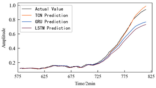The prediction results obtained using the TCN model are shown in Figure 33, and the prediction starts from the 580th sampling time, that is, the 1160th min. In order to illustrate the superiority of the method, the prediction results obtained using two commonly used time series data prediction models, LSTM network and GRU, are also shown in Figure 33. The evaluation indicators for three different prediction models are listed in Table 7. It can be seen that the prediction model based on the TCN predicts the performance degradation of the rolling contact fatigue specimen well. Moreover, it has the best fit with the actual performance degradation curve, and the prediction accuracy is higher. At the same time, the model evaluation index is also the best among the three models.